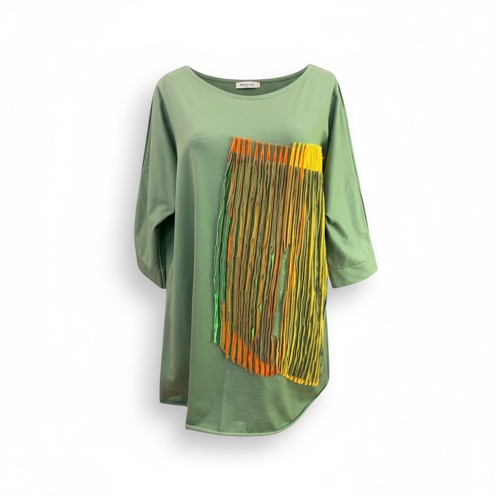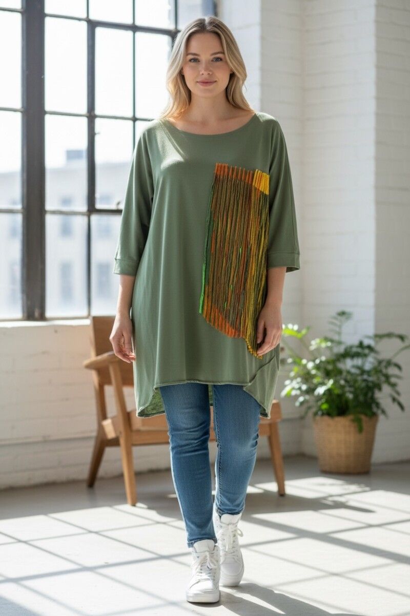 Unikatna jersey tunika je izdelana iz materiala bombažni jersey, ki nežno sledi gibanju telesa. Tunika ima na sprednjem delu tekstilno aplikacijo, ki dodatno razgiba enobarvno p0ovršino. Za ženske, ki rade izstopajo iz množice!