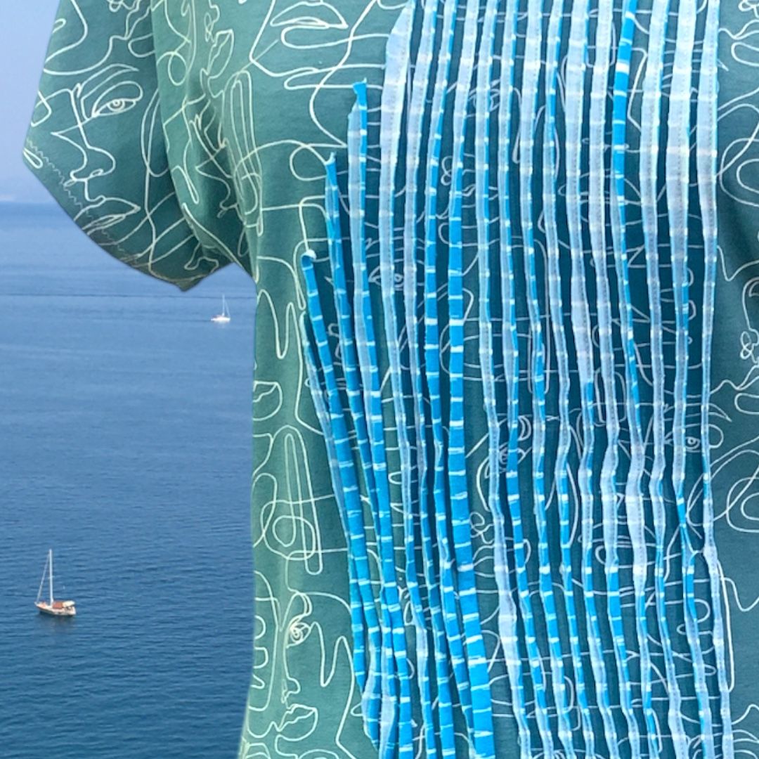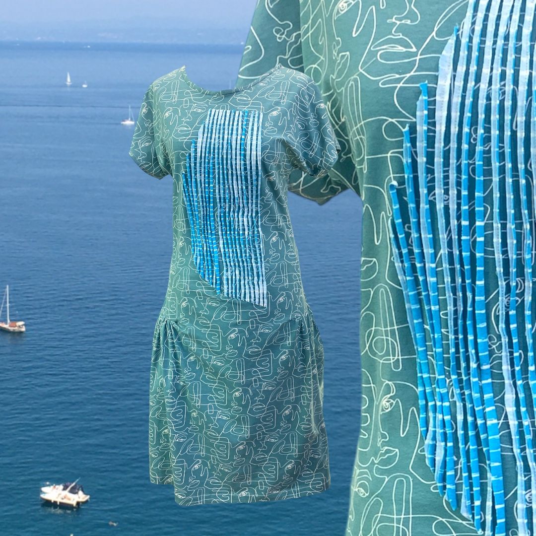 Umetniško oblikovana ženska obleka je izdelana iz jerseya v zelo modni mint barvi. Je umetniško porisana z značilnimi valovitimi tekstilnimi aplikacijami, ki ravno prav izstopajo, da pritegnejo pogled. Za ženske, ki so elegantne, igrive in rade izstopajo!