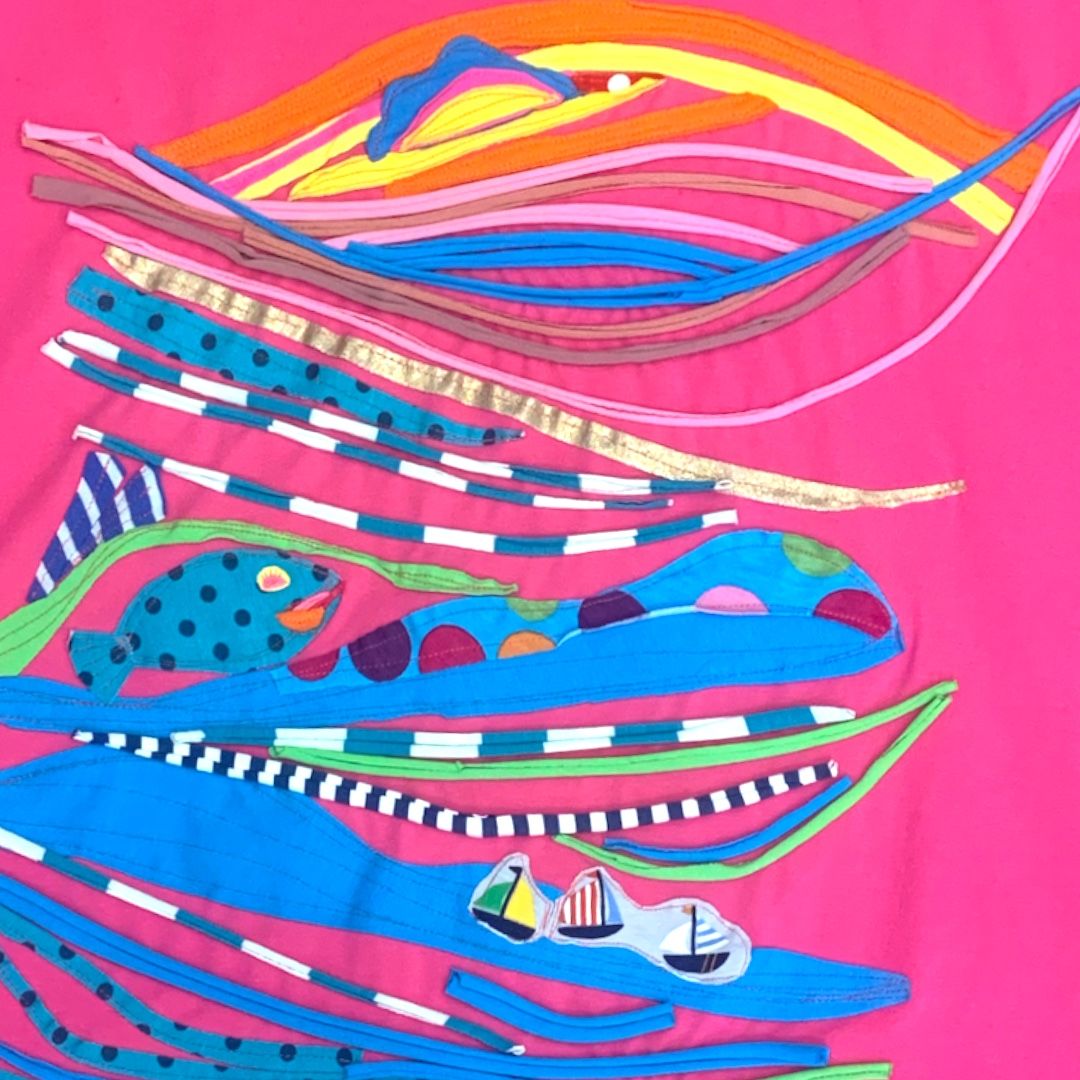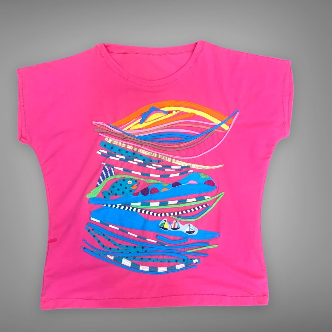 Unikatna majica s kratkimi rokavi elegantnega kroja je izdelana iz materiala bombažni jersey, ki se prilega telesu in sledi vsakemu gibu z novo obliko. Bluza je unikatno sestavljena iz različnih tekstilnih našitkov, ki prikazujejo morsko zgodbo. Za ženske, ki so rade opažene!