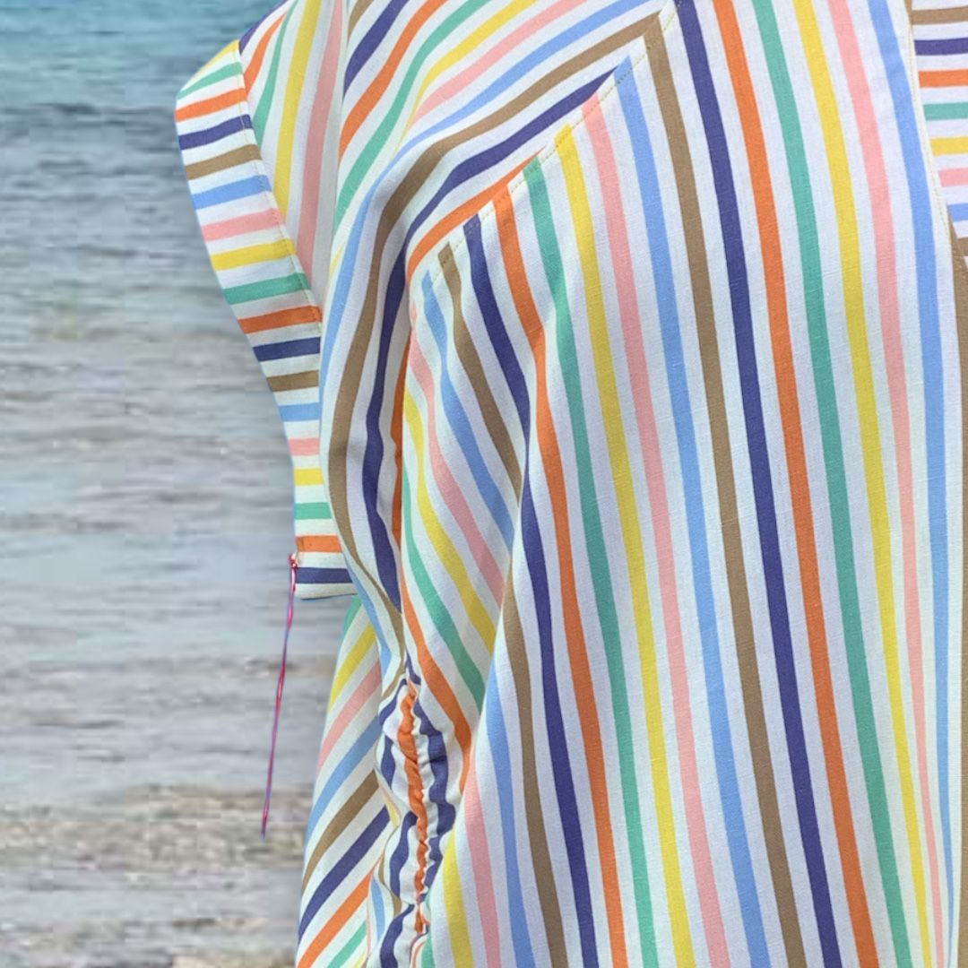 Unikatna lanena bliza v osvežilnem dezenu s pisanimi črtami, sproščen asimetrični kroj je primeren za različne postave, vratni izrez je krojen na ladjico.